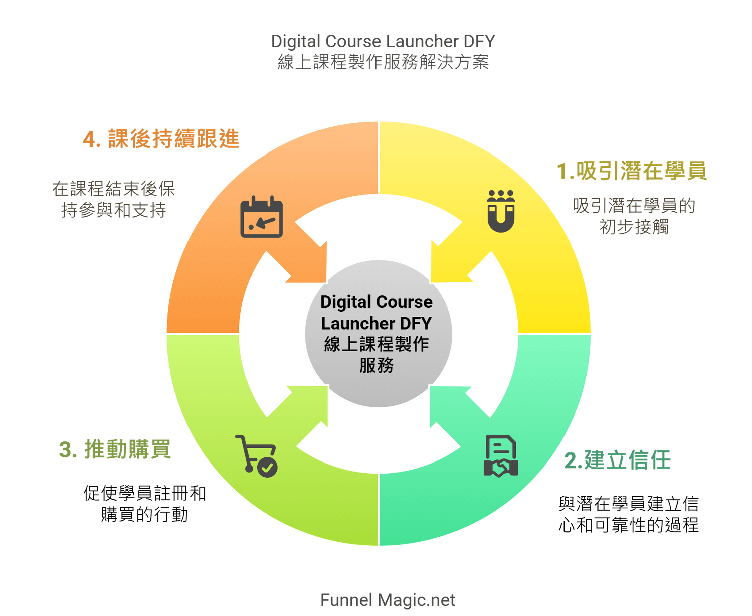 而是從吸引潛在學員 ➡️ 建立信任 ➡️ 推動購買 ➡️ 課後持續跟進