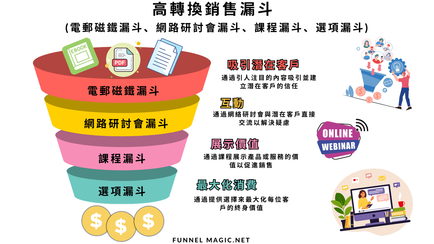 電郵磁鐵漏斗 ➡️ 網路研討會漏斗 ➡️ 課程漏斗 ➡️ 選項漏斗